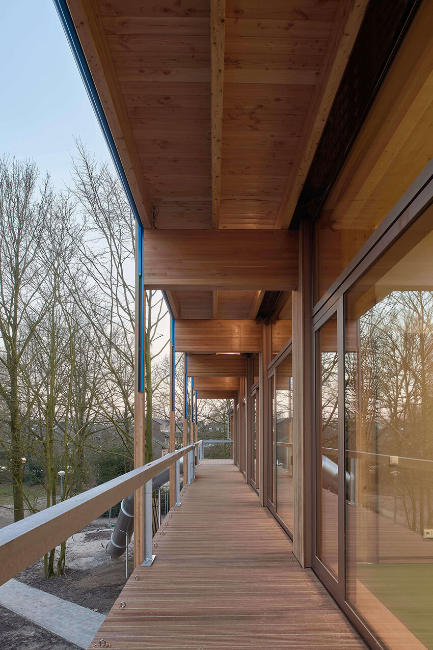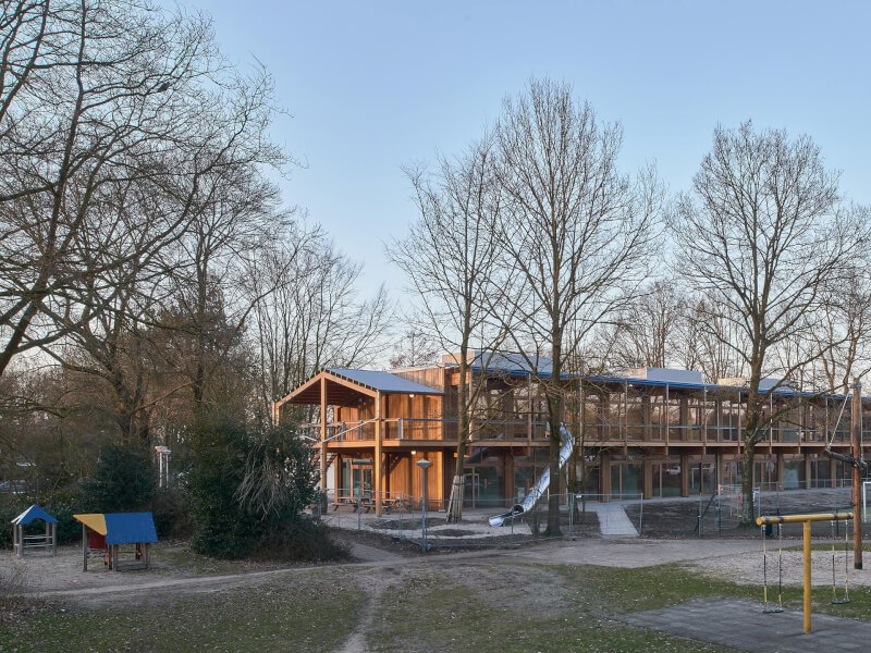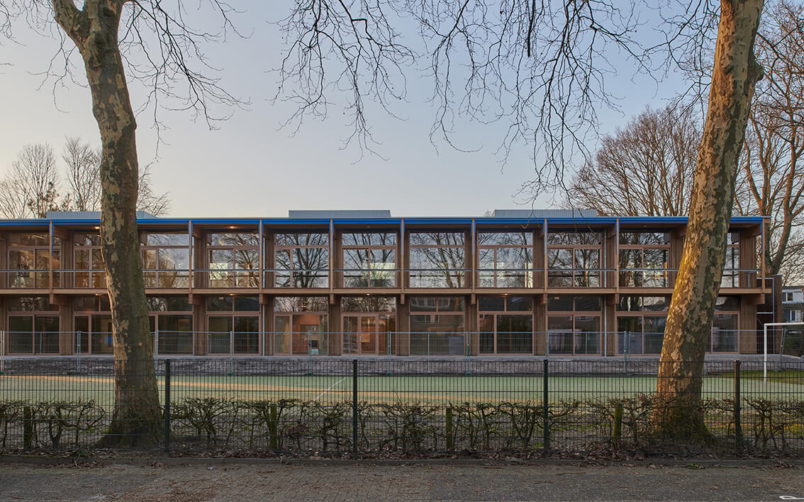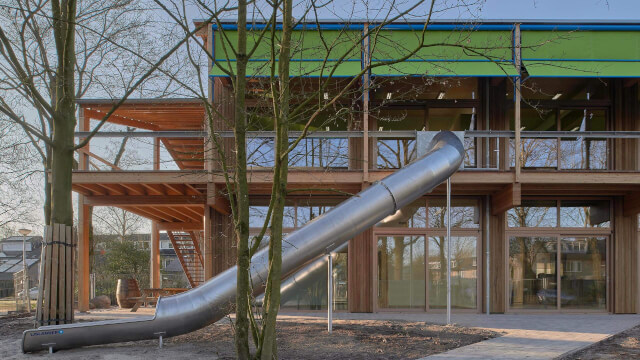 KettingHuls has transformed the original school and added a new wing, for which a small part of the existing school (the poorly connected 1985 extension) has been demolished. The new wing, built in a timber frame construction with an extra floor, offers numerous possibilities to connect inside and outside. It includes an outdoor classroom and the connection to the school yard with vegetable gardens.