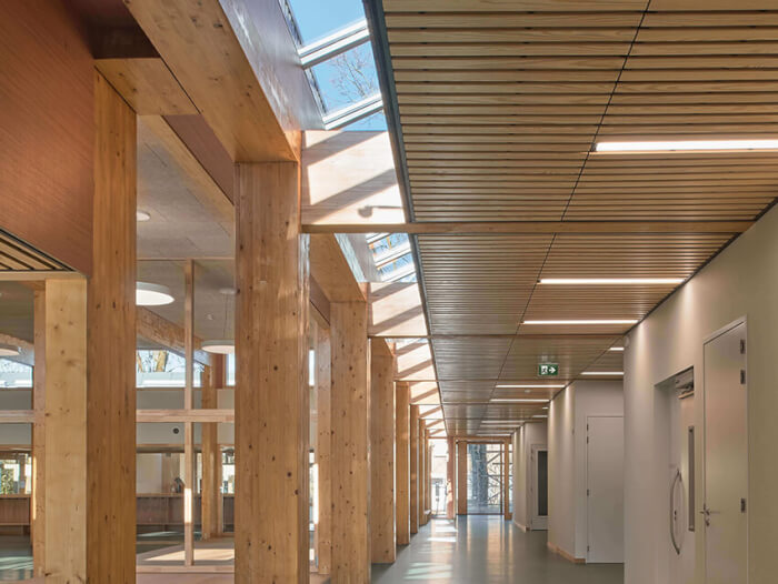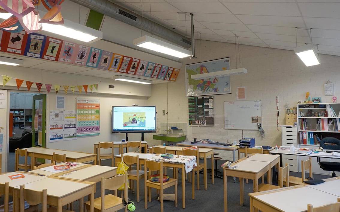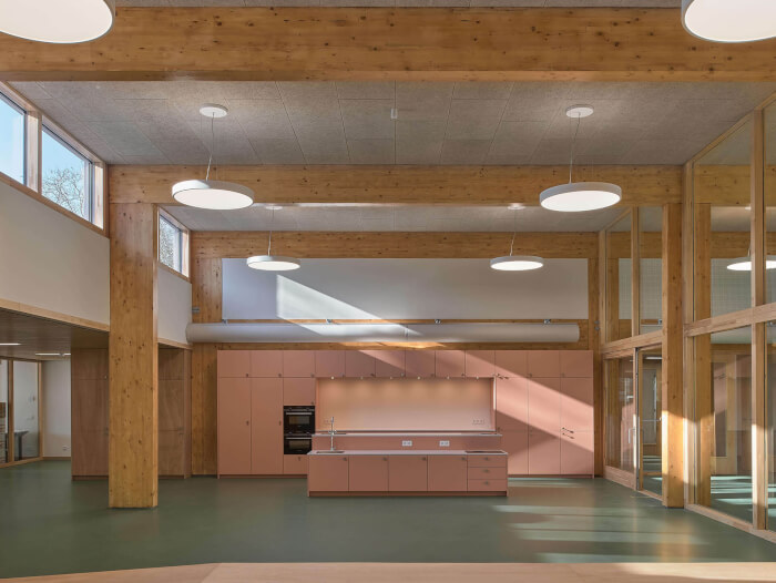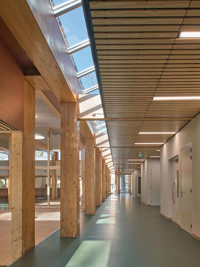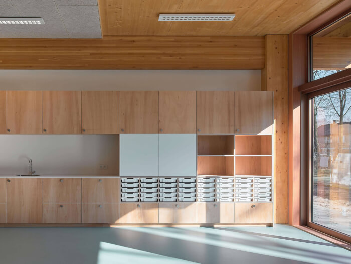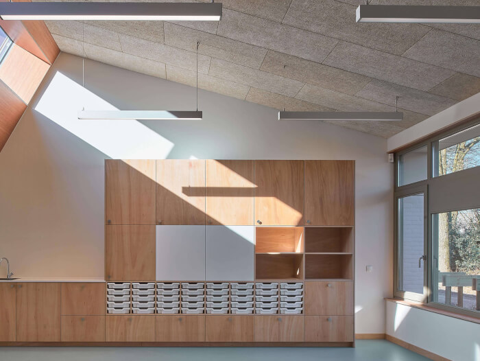 The new wing also allows the existing school to be internally rearranged, creating a central meeting space in its ‘heart’ where once the storage rooms and toilets used to be. Effective insulation, ventilation and other interventions ensure a very sustainable building.