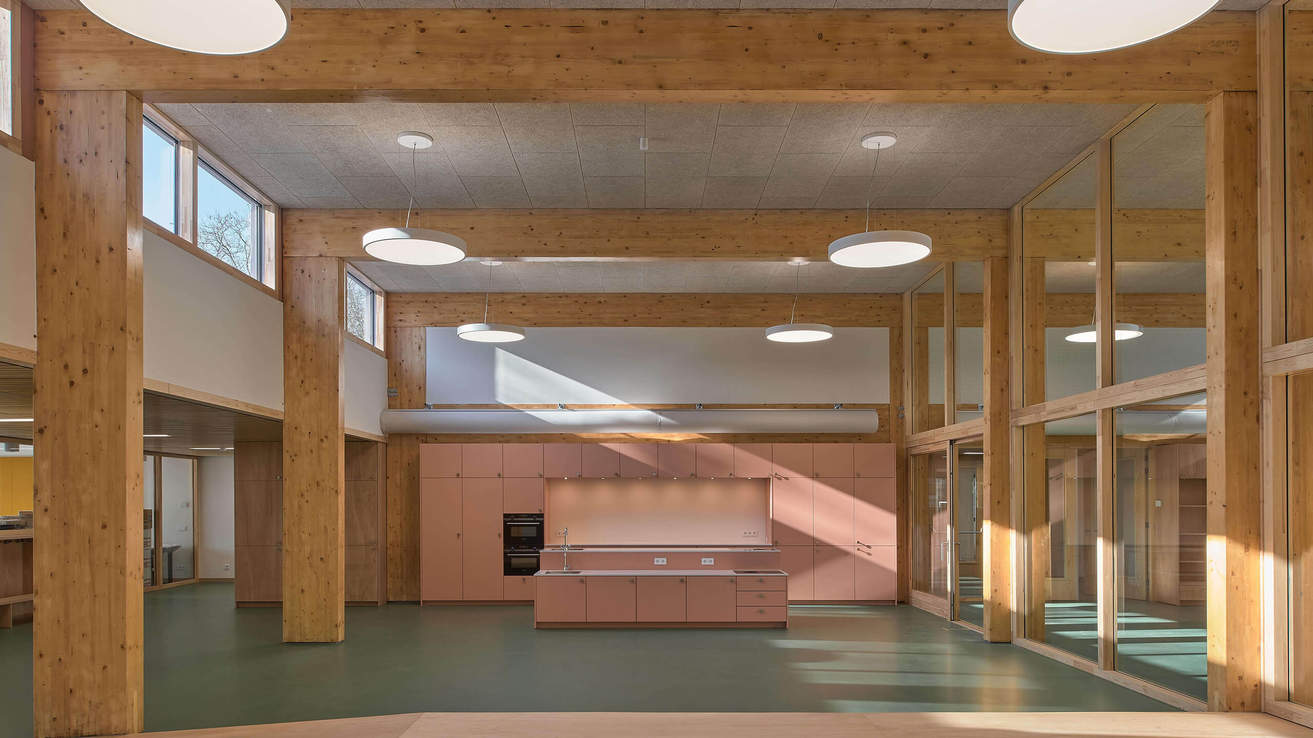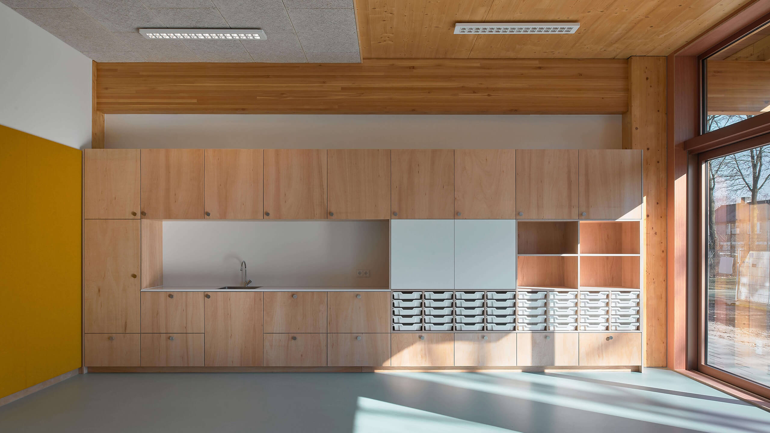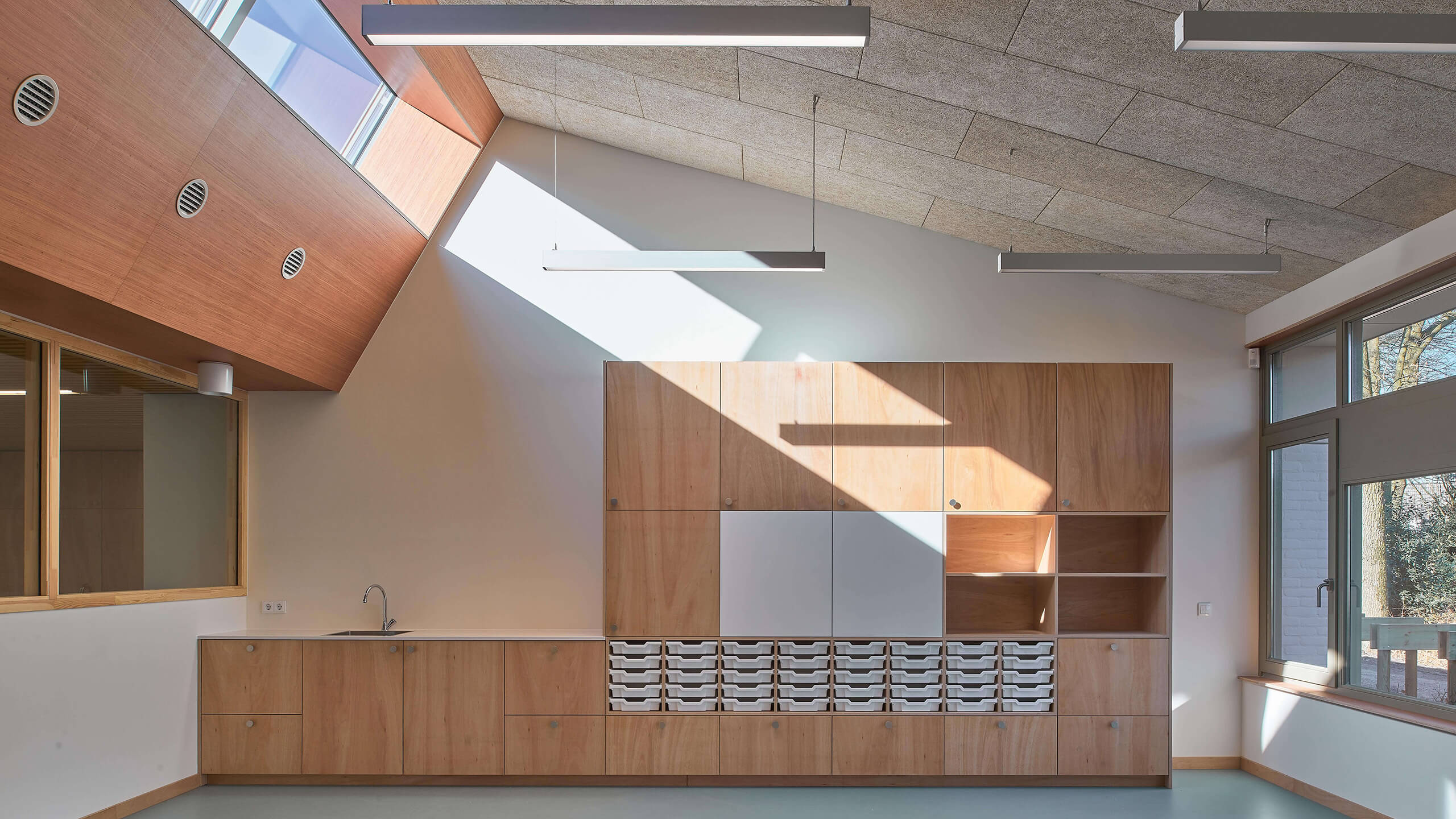 The new wing also allows the existing school to be internally rearranged, creating a central meeting space in its ‘heart’ where once the storage rooms and toilets used to be. Effective insulation, ventilation and other interventions ensure a very sustainable building.